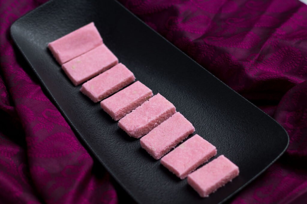 A pretty pink East Indian coconut sweet with a cashew twist in it. Perfect for the Christmas season